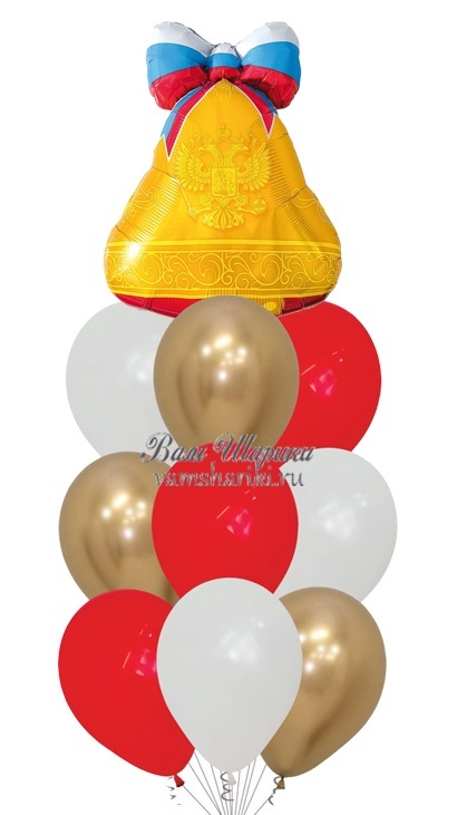 Прекрасный фонтан из шаров с гелием с колокольчиком для оформления 1 сентября в День Знаний школы. Состав букета: