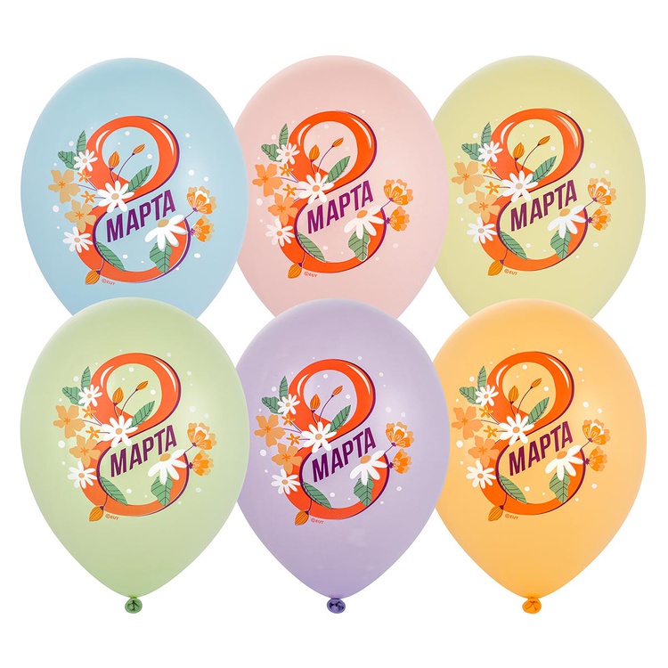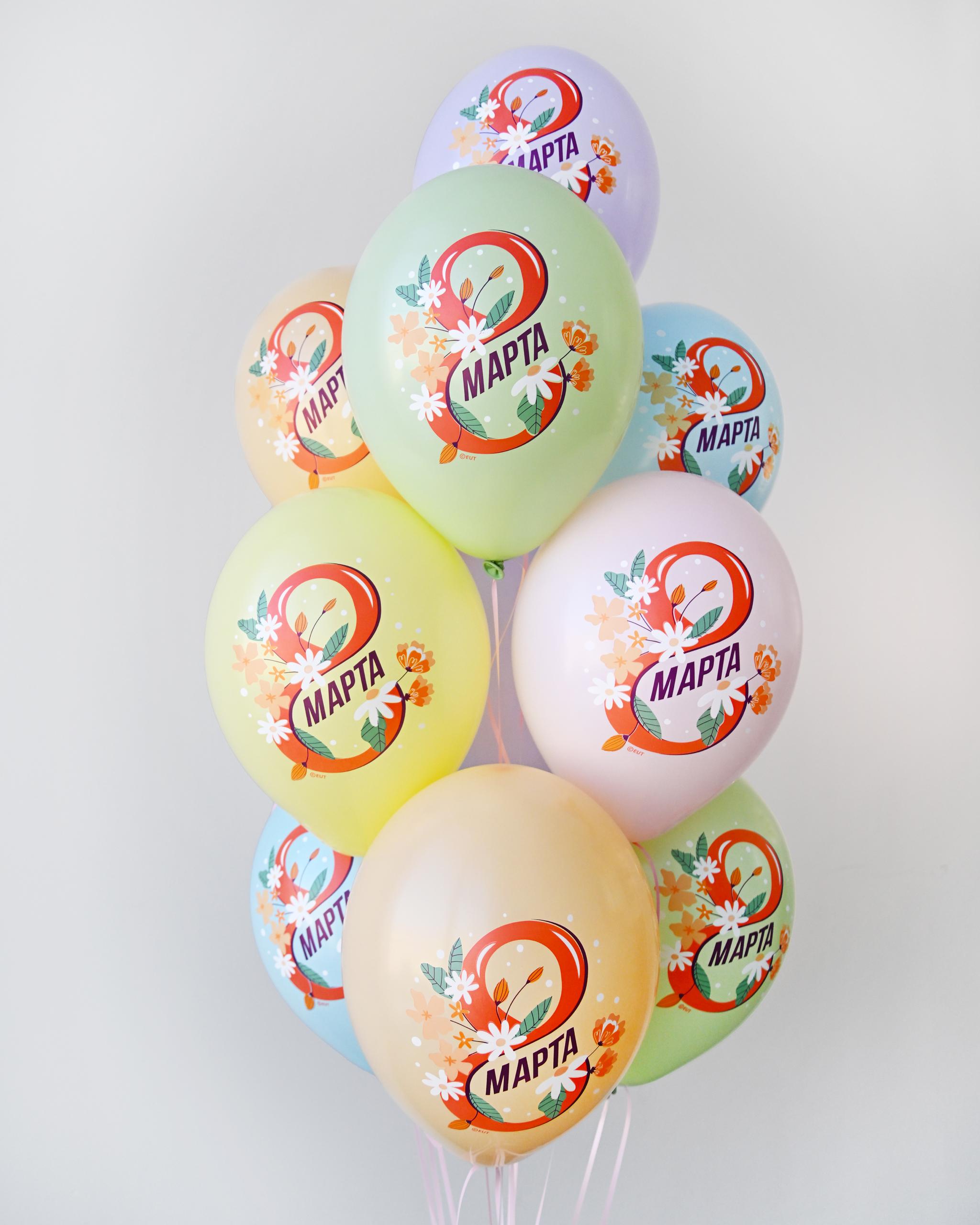 Очень красивые шарики для поздравления женщин с 8 марта на работе в офисе, дома, в кафе и других местах. Шары нежных оттенков с очень красивым рисунком - весенние цветы и надпись - 8 марта! Размер шаров 35 см, наполнены гелием и обработаны специальным составом для длительного полета.