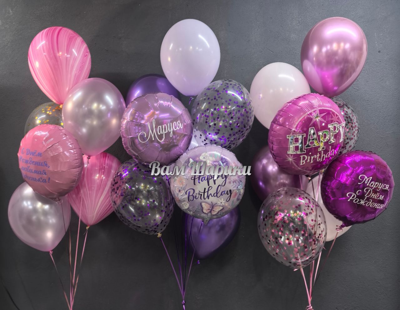 Небольшой набор шаров с гелием на День Рождения с бабочками в лавандовых оттенках. В составе фонтана:
