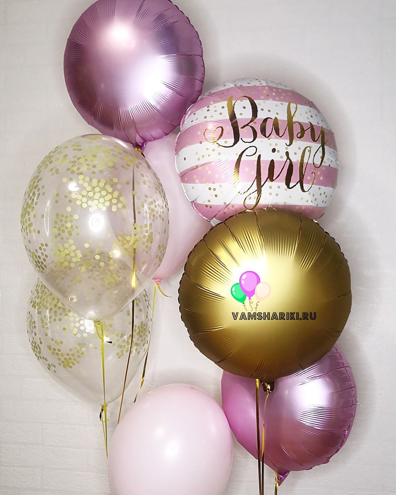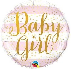 Фигурный шар из фольги с гелием в виде круга в розовую полоску с надписью - Baby Girl. Размер фигуры 46 см.