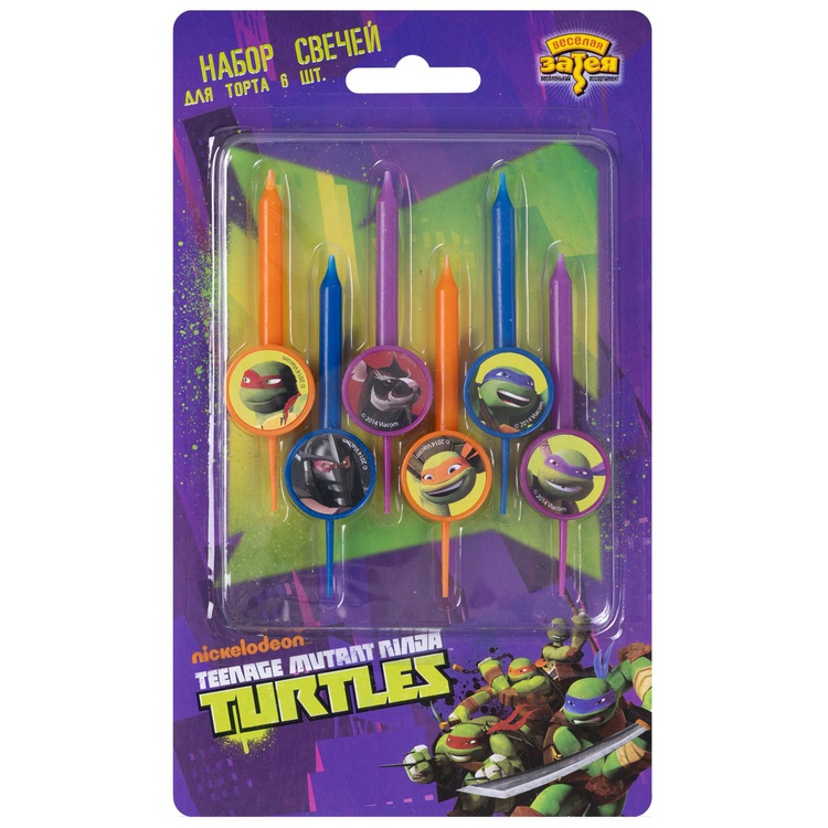 Свечи с подставками. На каждой подставке медальон с персонажем мультфильма Черепашки Ниндзя. Отличное решение для декорирования торта, десерта ко дню рождения. Стеарин, оригинальный дизайн. В упаковке 6 свечей.