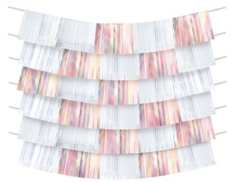 Набор гирлянд в виде бахромы 2х цветов - белый и перламутрово-розовый.  В упаковке 9 гирлянд длиной 150 см и высотой 25 см каждая. Можно использовать как гирлянду или декорировать стену для фотозоны.