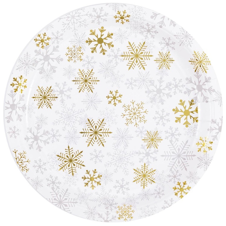 Одноразовые бумажные тарелки для оформления Новогодних праздников в белом цвете со снежинками. В упаковке 6 шт, размер 23 см. Материал - картон.
