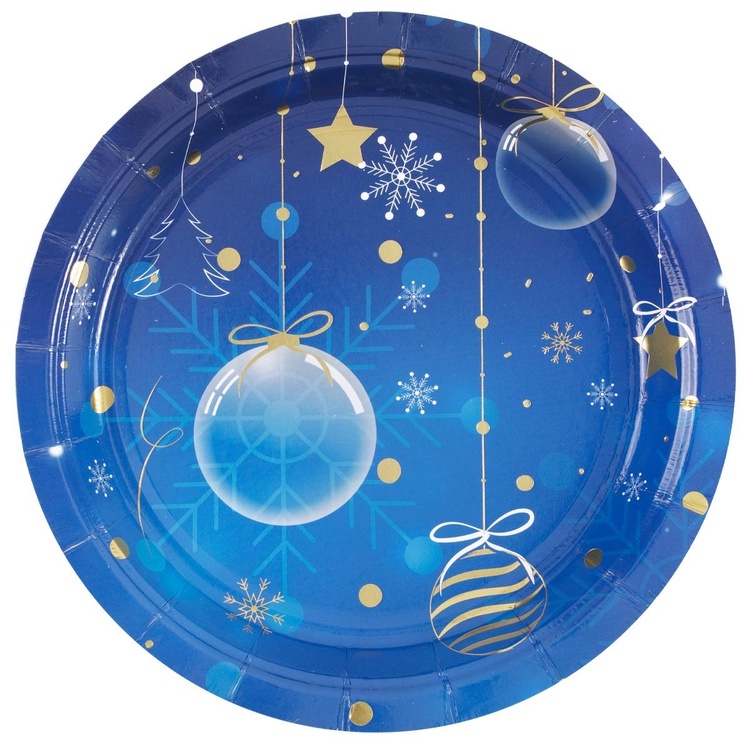 Одноразовые бумажные тарелки для оформления Новогодних праздников в золотом и синем цвете. В упаковке 6 шт, размер 17 см. Материал - картон.