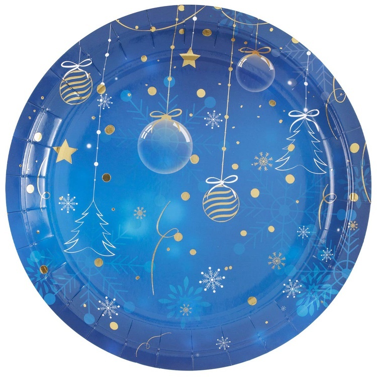 Одноразовые бумажные тарелки для оформления Новогодних праздников в золотом и синем цвете. В упаковке 6 шт, размер 23 см. Материал - картон.