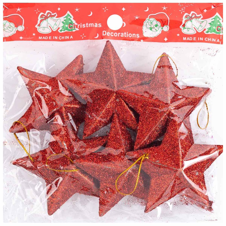Элемент декора на Новогодние праздники - украшение на елку и т.п. в виде красных подвесных звезд с блестками.  Размер 7 см, в упаковке 6 шт.