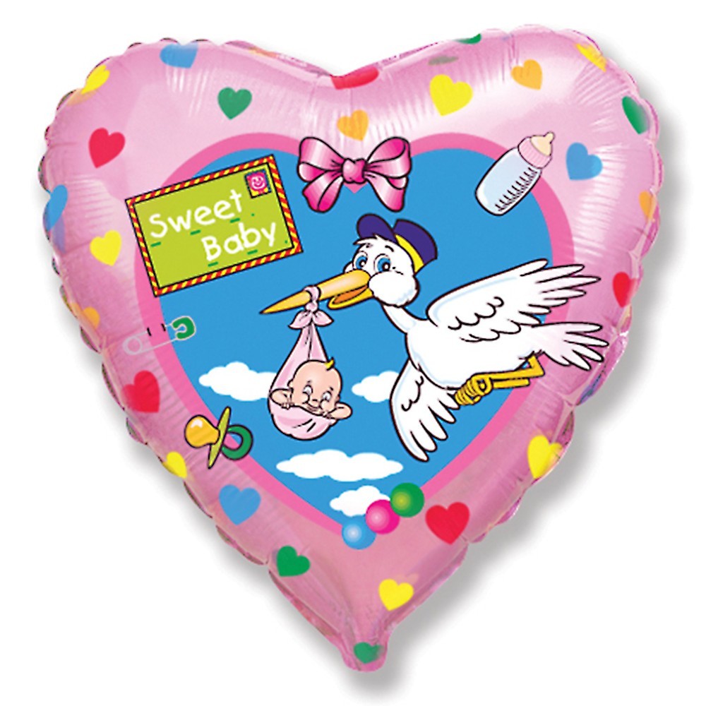Фигурный шар в виде сердца розового цвета на выписку из роддома с аистом для девочки, размер фигуры 46 см. Наполнен гелием.