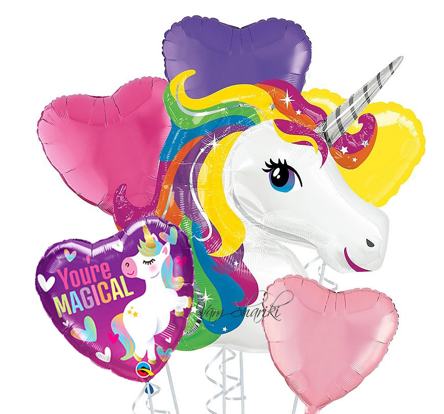 Яркий, красочный букет из фольгированных фигур с гелием в стиле Единорога, который достаточно долго будет радовать девочку или девушку) Соста букета: