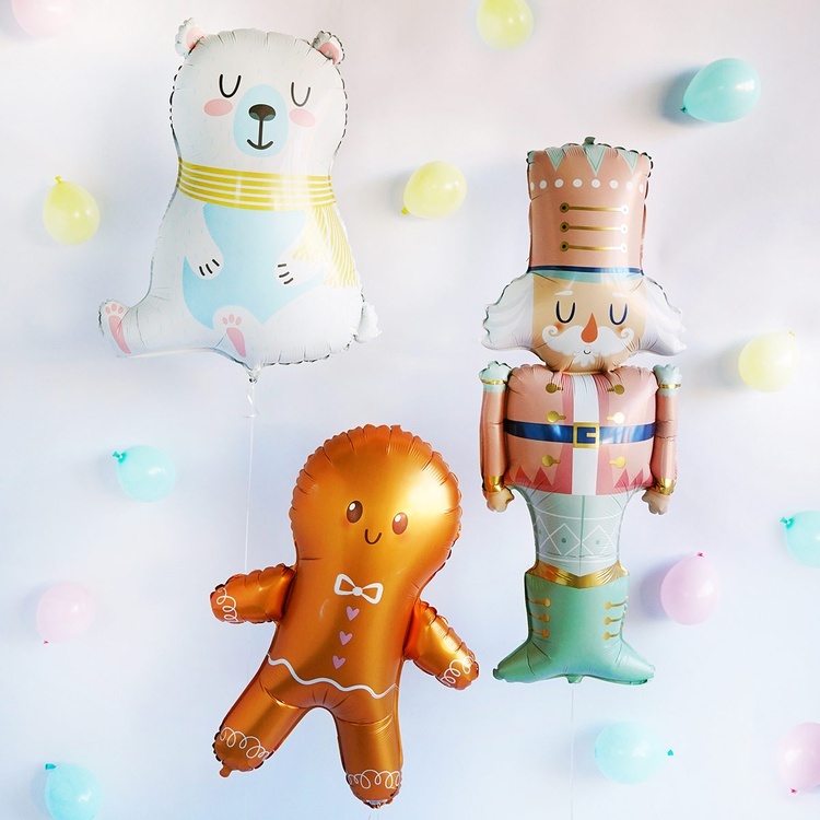 Фигурный шар из фольги с гелием в виде рождественского пряничного человечка с пуговками-сердечками - отличный подарок ребенку на рождественский праздники. Размер фигуры без учета наполнения - 74 см.