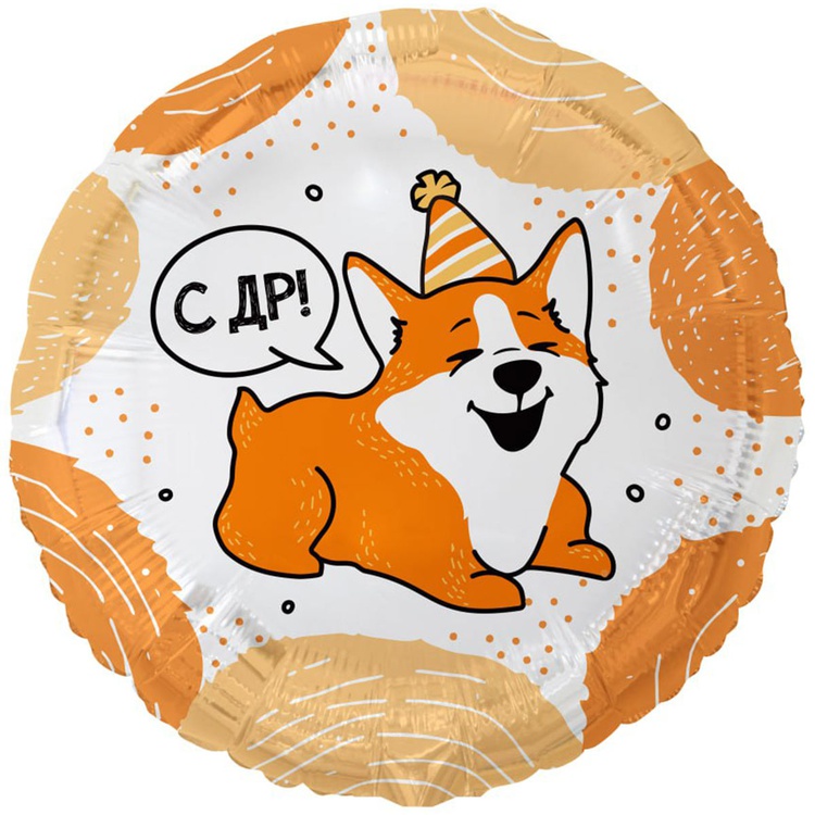 Фигурный шар из фольги с гелием в виде круга в пастельном цвете с милой собачкой породы Корги и надписью - С ДР! и ВАФ! Внимание: шар с каждой стороны имеет разный рисунок и надпись! Размер фигуры 46 см в ненаполненном виде.