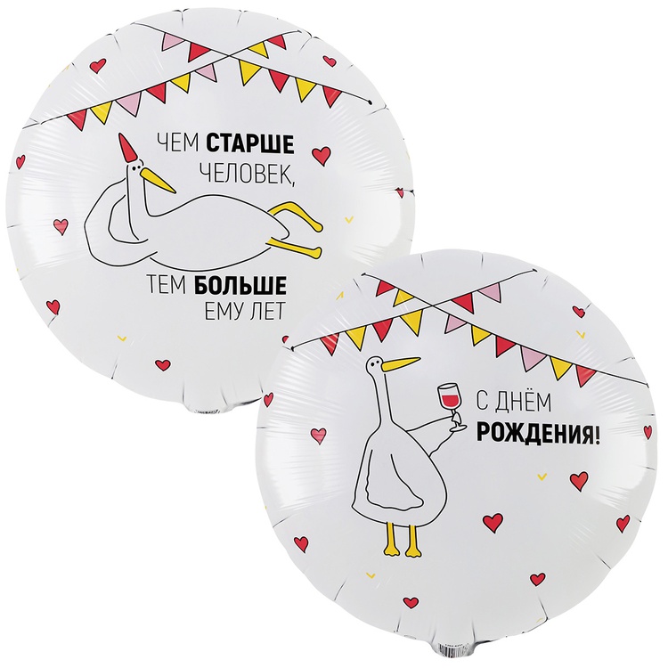 Фигурный шар из фольги с гелием в виде круга на День Рождения с изображением гуся и надписью - Чем старше человек, тем больше ему лет! Для подарка человеку с чувством юмора. ВНИМАНИЕ - ШАР ДВУХСТОРОННИЙ, НА КАЖДОЙ СТОРОНЕ РАЗНЫЙ ДИЗАЙН! Размер фигуры без учета наполнения 46 см.