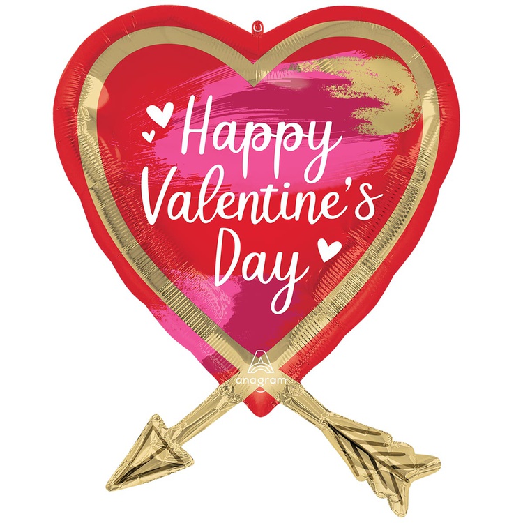 Фигурный шар из фольги с гелием в виде большого сердца с золотой стрелой Амура с поздравлением с Днём Святого Валентина! Размер шара без учета наполнения 74 см.