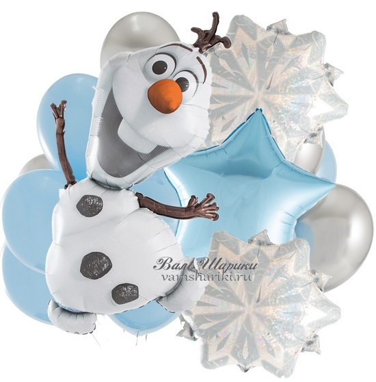 "Морозный" набор шаров с гелием с веселым снеговиком Олафом из мультфильма "Холодное Сердце", он стал любимчиком многих девочек и даже мальчиков, а у нас Вы можете заказать классный набор шаров с ним в главной роли. Состав букета: