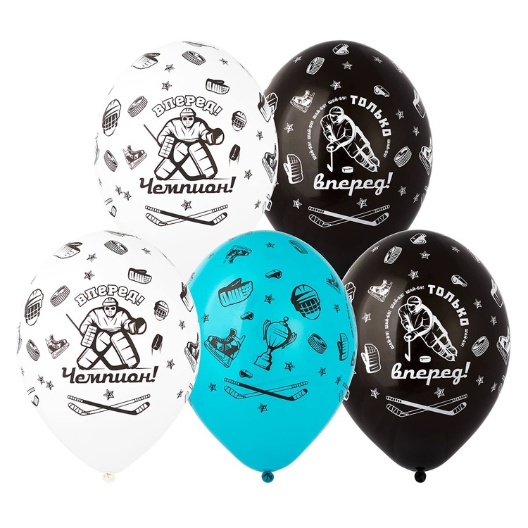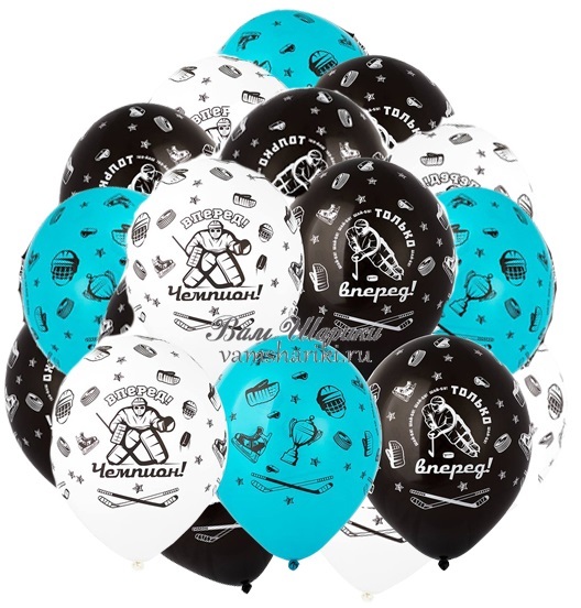 Шарики из натурального латекса белого, ярко-голубого и черного цветов с изображением по всему объему шарика хоккеиста, клюшек, шлемов, кубком, шайбы и прочей хоккейной амуниции, а так же надписей - Только Вперёд и Вперёд Чемпион. Прекрасный подарок для мальчиков и мужчин. Размер шаров 35 см, наполнены гелием и обработаны составом для длительного полета.