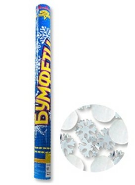 Пневматическое устройство, аналог хлопушки, абсолютно безопасное, предназначено для использования в помещении и на улице, дальность выстрела 6-8 м. Корпус хлопушки состоит из двух частей: пневматического баллона со сжатым воздухом и картонного цилиндра с наполнителем. Баллон изготовлен из металла, надежен и безопасен при хранении и в использовании, обладает высокой прочностью, чтобы выдержать давление воздуха. Встреливает серебряное фольгированное конфетти в форме снежинок и белые бумажные кружочки.