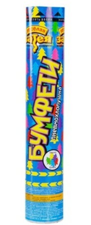 Пневматическое устройство, аналог хлопушки, абсолютно безопасное, предназначено для использования в помещении и на улице, дальность выстрела 6-8 м. Корпус хлопушки состоит из двух частей: пневматического баллона со сжатым воздухом и картонного цилиндра с наполнителем. Баллон изготовлен из металла, надежен и безопасен при хранении и в использовании, обладает высокой прочностью, чтобы выдержать давление воздуха. Выстреливает разноцветным фольгированным конфетти в форме бумажных цветных елочек.