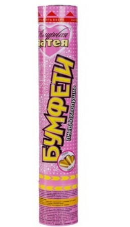 Пневматическое устройство, аналог хлопушки, абсолютно безопасное, предназначено для использования в помещении и на улице, дальность выстрела 6-8 м. Корпус хлопушки состоит из двух частей: пневматического баллона со сжатым воздухом и картонного цилиндра с наполнителем. Баллон изготовлен из металла, надежен и безопасен при хранении и в использовании, обладает высокой прочностью, чтобы выдержать давление воздуха. Выстреливает золотым фольгированным конфетти в форме сердец.