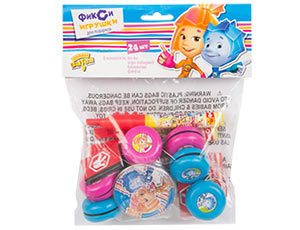 В комплект входит 4 вида различных игрушек по 6 штук каждой - йо-йо, флейта, лабиринт, записная книжечка. Вы можете собрать минимум 6 пакетиков с подарками для деток.
