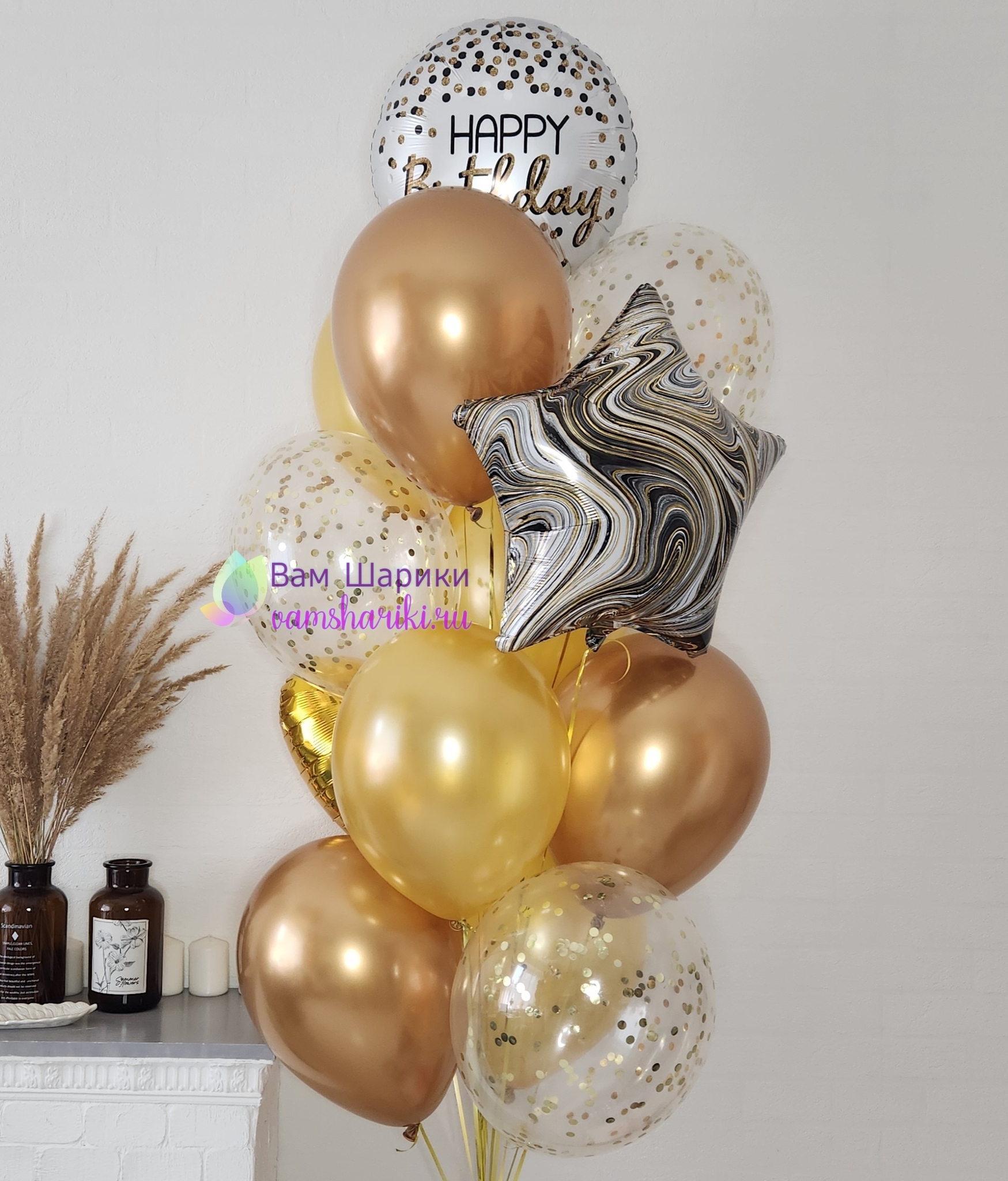 Золотые шарики и шары с конфетти на День Рождения в подарок