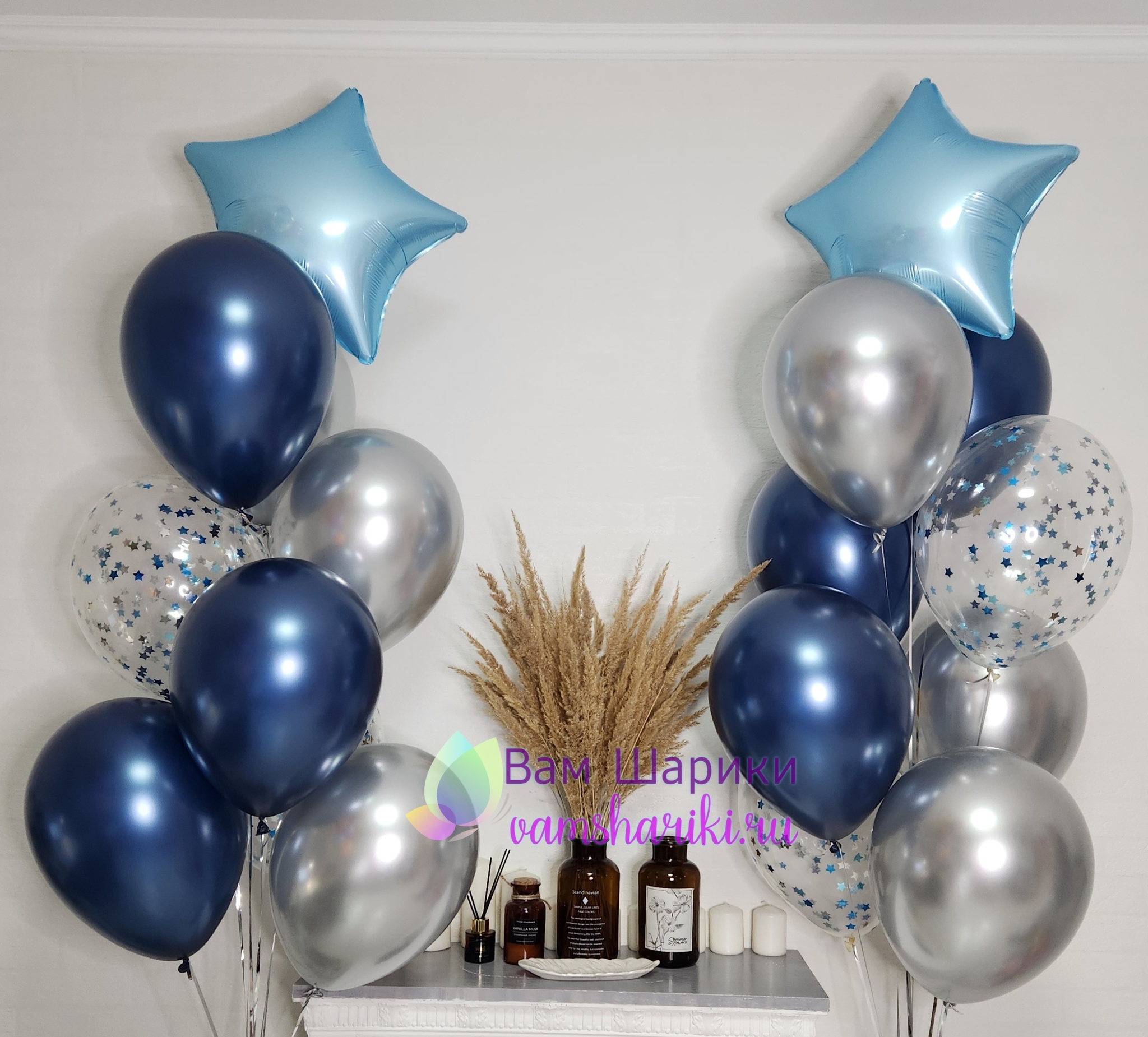 Фонтаны из шаров с гелием серебряного и синего цвета