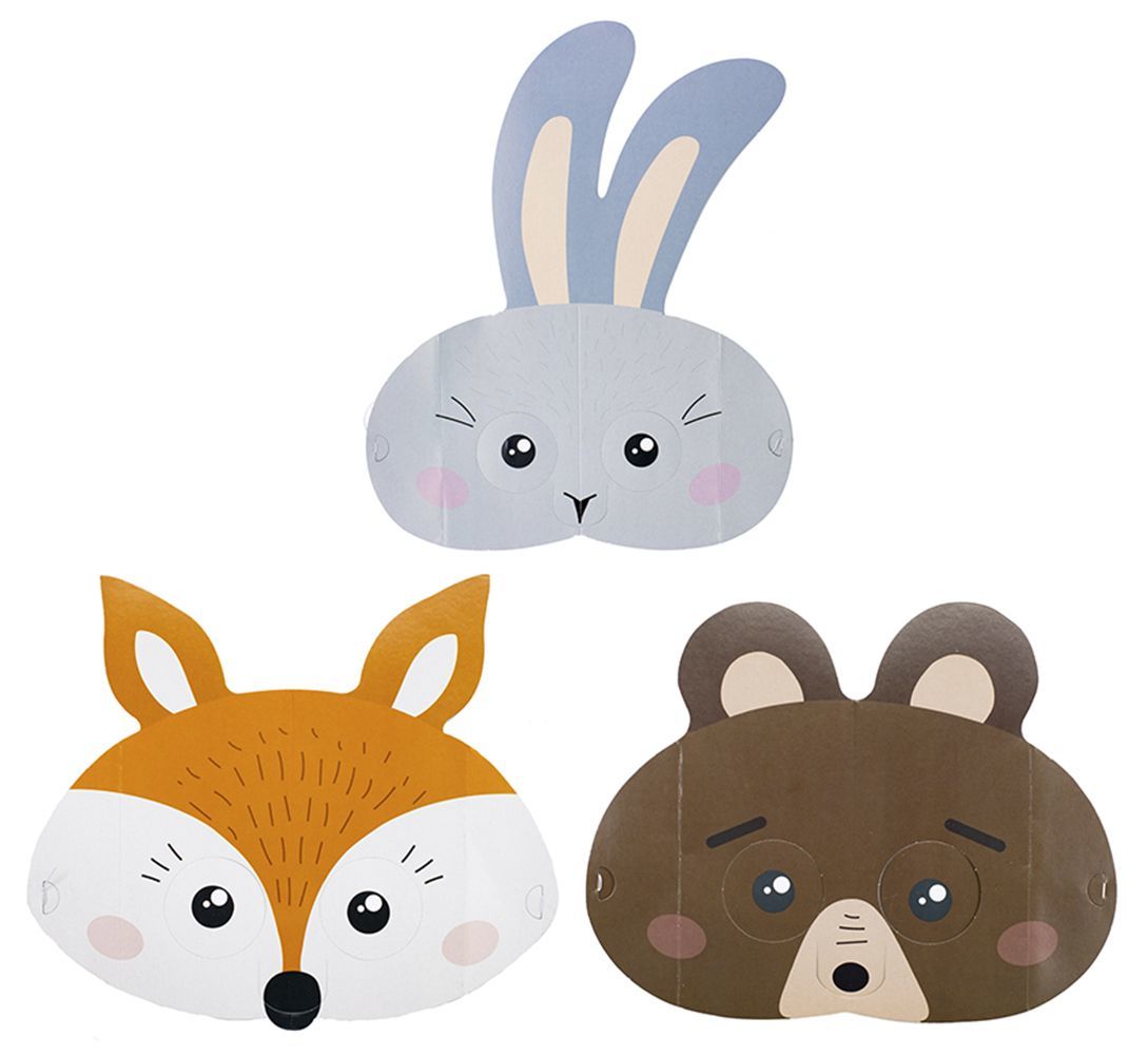 Маски для детей для костюмированного праздника. В наборе маски трех персонажей в стиле Лесные зверюшки: медведь, лиса и заяц. Всего 3 маски. Материал - картон, на резинке.