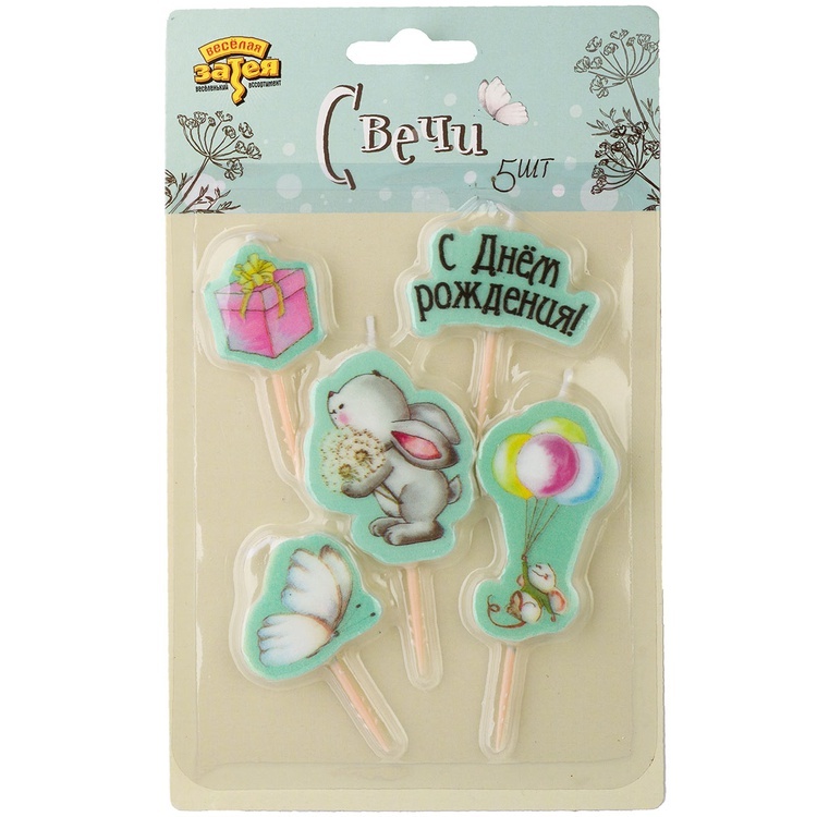 Красивые и милые свечки-фигурные в торт для детей на День Рождения с зайкой, шариками, тортиком и т.п. Размер примерно 3-4,5 см. Свечи на пиках, 5 шт в упаковке.