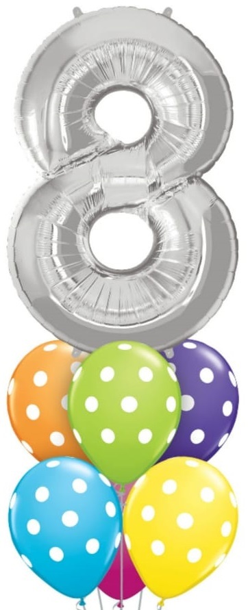 Букет шариков с большой цифрой станет отличным подарком и хорошим дополнением к основному оформлению праздника. Шарики цветные в горошек - вариант на любой возраст, пол и праздник! Состав букета: