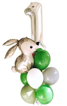 Красивый букет из шариков с гелием для подарка малышу на Первый День Рождения (номер цифры может быть другой) с милым зайкой из фольги! В состав входят: