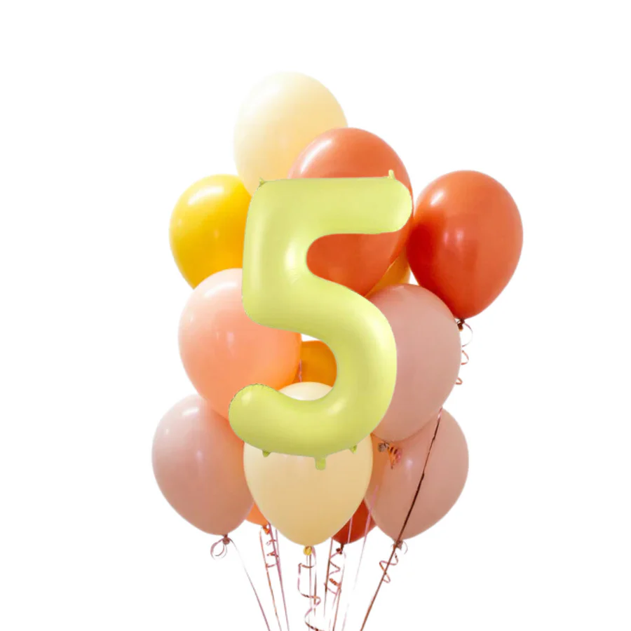Солнечный букет из латексных шаров в желто-оранжевой гамме и цифры 5 (или другой номер) нежно-лаймового цвета на День Рождения девочке или мальчику! В состав входят: