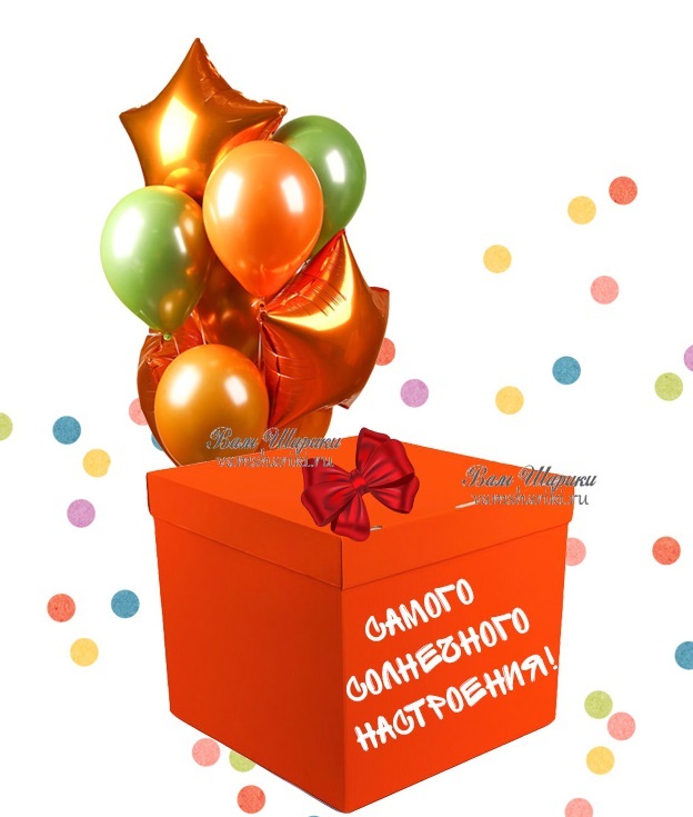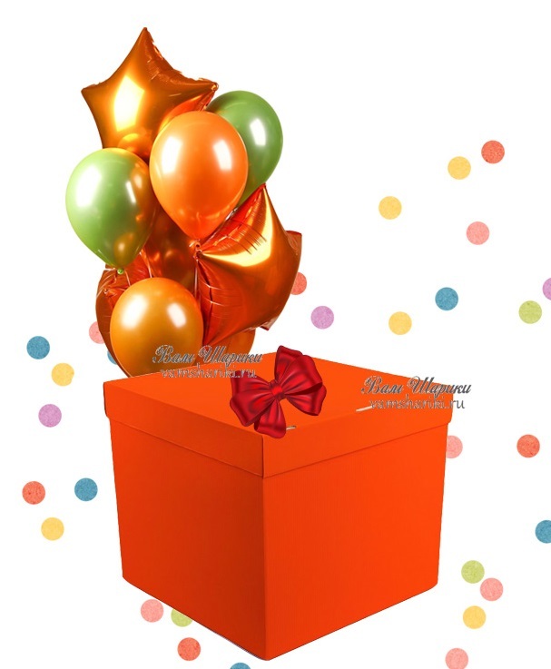 Данный вариант - это коробка оранжевого цвета 60х60 см с отдельной крышкой и букет из гелиевых шаров (8 шт). В комплект входят: