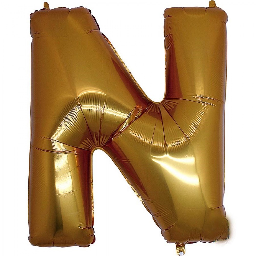 Фигурный шар из фольги с гелием в виде золотой буквы "N" английского алфавита, размер фигуры 102 см. Шар наполнен гелием и установлен на грузик ручной работы.