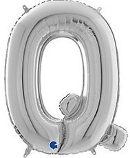 Фигурный шар из фольги с гелием в виде серебряной буквы "Q" английского алфавита, размер фигуры 65 см. Шар наполнен гелием и установлен на грузик ручной работы.