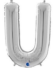 Фигурный шар из фольги с гелием в виде серебряной буквы "U" английского алфавита, размер фигуры 65 см. Шар наполнен гелием и установлен на грузик ручной работы.