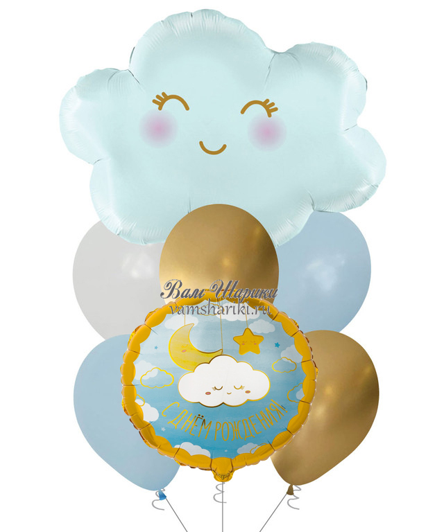 Небольшой фонтан гелиевых шаров в голубых цветах на День Рождения малыша. Состав букета: