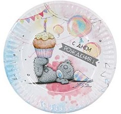Бумажная круглая тарелка (диаметр 17см). Содержит надпись "С ДНЁМ РОЖДЕНИЯ". Выполнена в нежных акварельных тонах. Используется совместно с другими элементами коллекции Me To You как украшение стола или по своему непосредственному назначению. В упаковке 6 тарелочек.