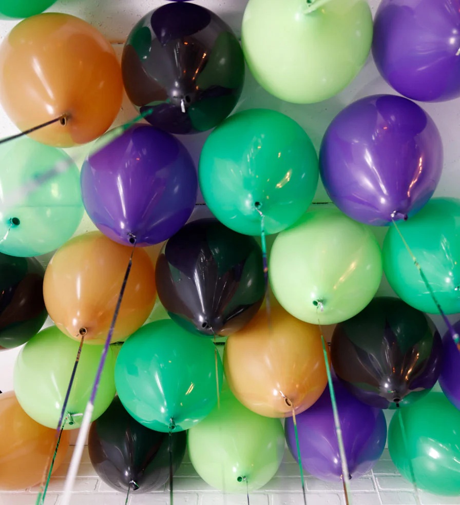 Шарики с гелием из натурального биоразлагаемого латекса длительного полета (от 3х и более дней) в количестве 20 шт с цветными или серебряными ленточками. Данный набор включает такие цвета - коричневые, салатовые, зеленые, фиолетовые и черные - что создает атмосферу праздника в стиле Черепашек Ниндзя! Поэтому прекрасно подойдет по цветовому набору для оформления праздника мальчику, количество оптимально для домашней комнаты или для небольшого помещения - лофта, кафе, детской комнаты. Размер шаров 30 см.