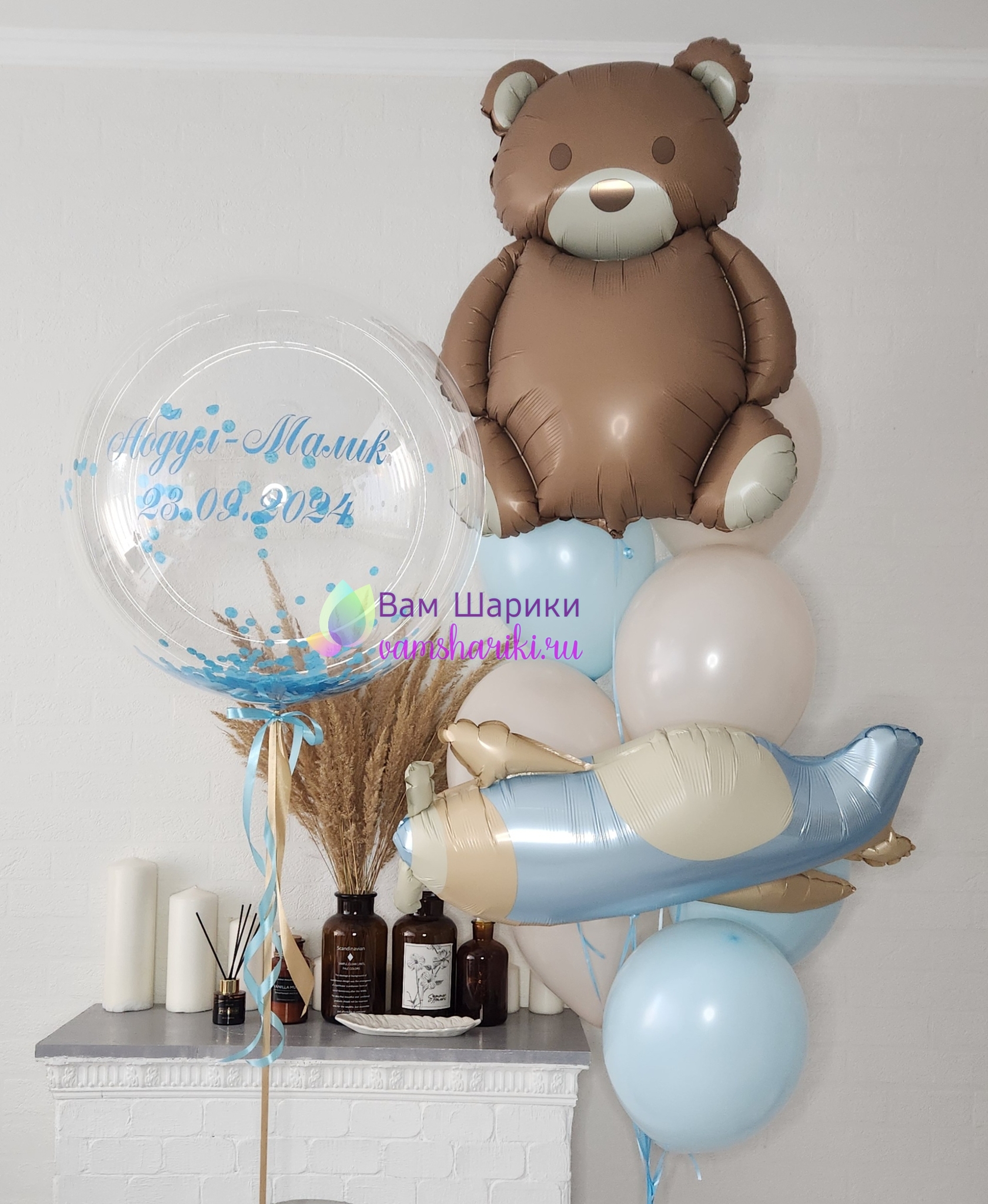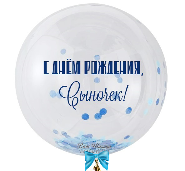 Кристально-прозрачный шар из искусственного материала, который наполнен бумажными легкими конфетти любого цветового решения (по согласованию с менеджером), и оформлен атласной лентой. Сам шар наполнен гелием и установлен на грузик. Это вариант очень стильного и красивого оформления или для организации фотосессии, поэтому время полета от 1го дня и более. На шар можно нанести любую Вашу надпись, которые Вам необходимо после оформления заказа прислать на WhatsApp или указать в комментариях к заказу. Размер такого шара может быть от 50 до 55 см в наполненном виде.