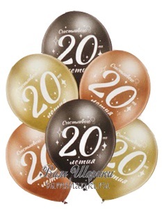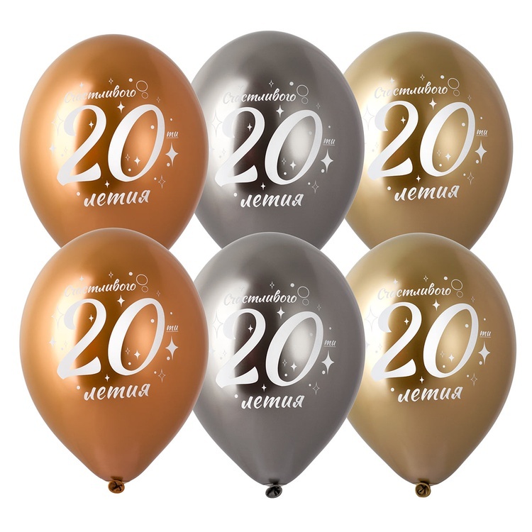 Шары из натурального латекса трех цветов Хром (с блеском) - золотые, медные и темно-серые (графит). Размер шаров 30 см, наполнены гелием и обработаны специальным составом для длительного полета. На шарах изображены цифры 20.