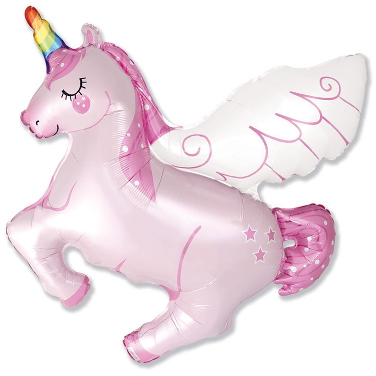 Фигурный шар из фольги с гелием в виде розового Единорога с белыми крыльями, размер 113х108 см без гелия.