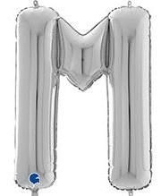 Фигурный шар из фольги с гелием в виде серебряной буквы "М" русского алфавита, размер фигуры 65 см. Шар наполнен гелием и установлен на грузик ручной работы.