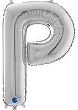 Фигурный шар из фольги с гелием в виде серебряной буквы "Р" русского алфавита, размер фигуры 65 см. Шар наполнен гелием и установлен на грузик ручной работы.