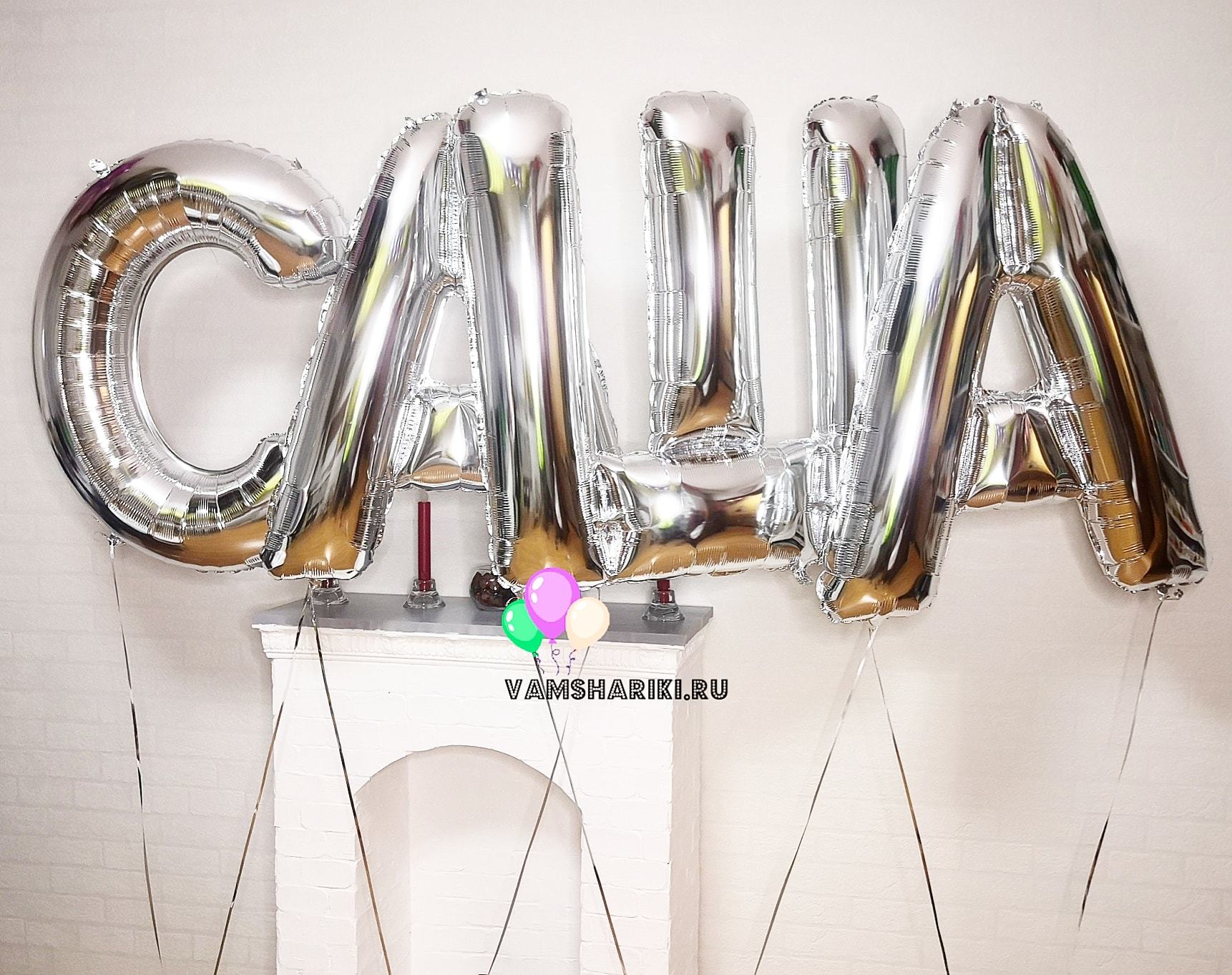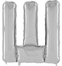 Фигурный шар из фольги с гелием в виде серебряной буквы "Ш" русского алфавита, размер фигуры 65 см. Шар наполнен гелием и установлен на грузик ручной работы.