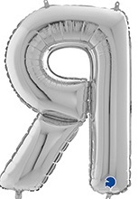Фигурный шар из фольги с гелием в виде серебряной буквы "Я" русского алфавита, размер фигуры 65 см. Шар наполнен гелием и установлен на грузик ручной работы.