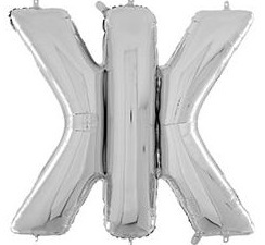 Фигурный шар из фольги с гелием в виде серебряной буквы "Ж" русского алфавита, составляется из двух элементов, размер фигуры 65 см. Шар наполнен гелием и установлен на грузик ручной работы.