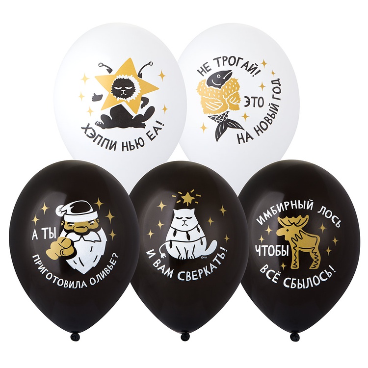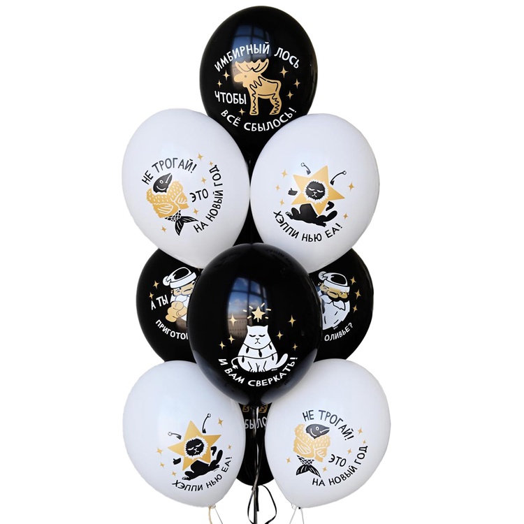 Шары из натурального латекса в белом и черном цвете с прикольными и забавными фразами на Новый Год. Размер шаров 35 см, наполнены гелием и обработаны специальным составом для длительного полета.