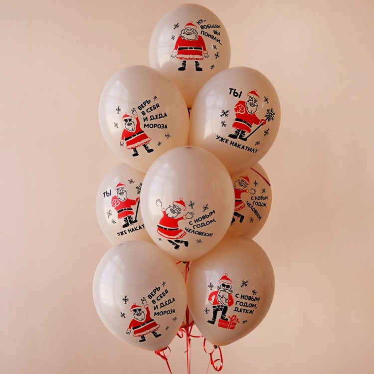 Шары из натурального латекса в бежевом цвете с прикольными и забавными фразами от Деда Мороза на Новый Год. Размер шаров 35 см, наполнены гелием и обработаны специальным составом для длительного полета.