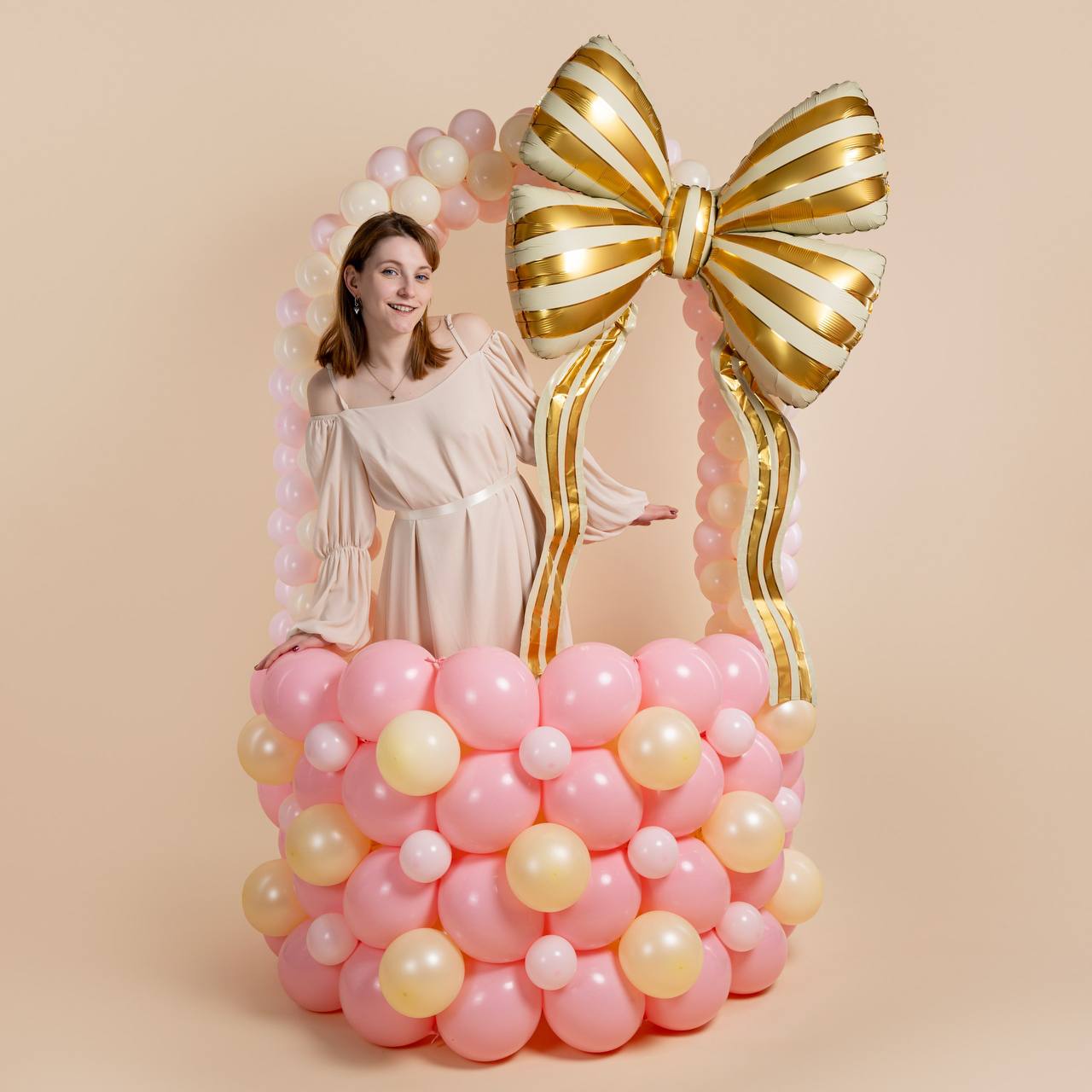 Фигурный шар из фольги с гелием в виде банта в полоску золотого и кремового цвета со свисающими "фольгированными ленточками", размер фигуры без учета наполнения 155 см. Фигура доставляется с гелием. Отличный вариант для подарка на любой праздник, а так же для декорирования фотозоны!