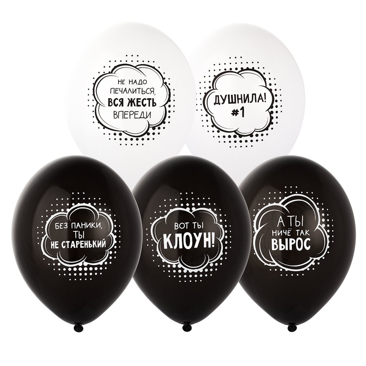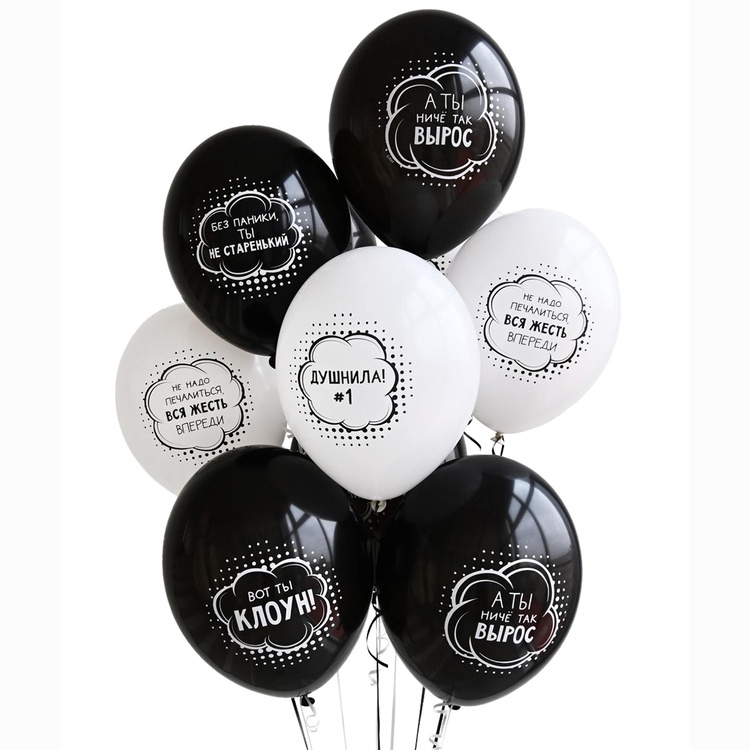 Гелиевые шары из натурального латекса белого и черного цветов с поздравительными и прикольными надписями парню на День Рождения! Размер 35 см, наполнены гелием и обработаны специальным составом для длительного полета.