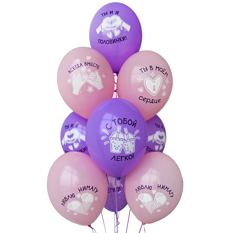 Красивые шары светло-фиолетового и розового цвета из натурального латекса с надписями - с тобой легко, ты и я половинки, всегда вместе, люблю-нимагу, ты в моем сердце. Отличный подарок близкому человеку на 14 февраля или просто в знак любви. Размер шаров 35 см, наполнены гелием и обработаны специальным составом для длительного полета.