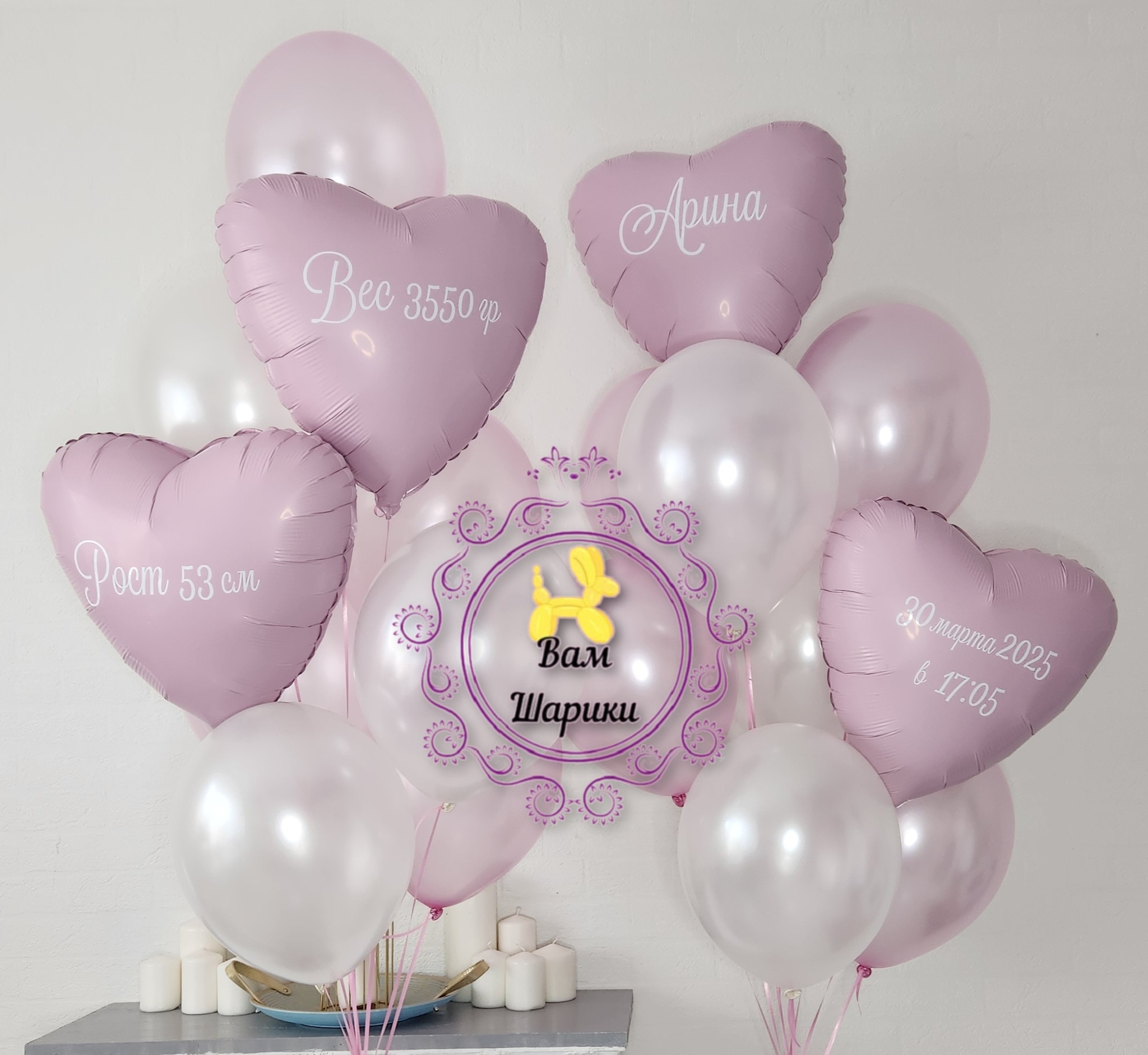 Очень интересный букет из латексных и фольгированных шариков, где мы напишем - имя, дату рождения, время рождения, вес и рост малыша или малышки. С таким букетом Вы сделаете памятные фотографии и порадуете маму и папу). Состав: